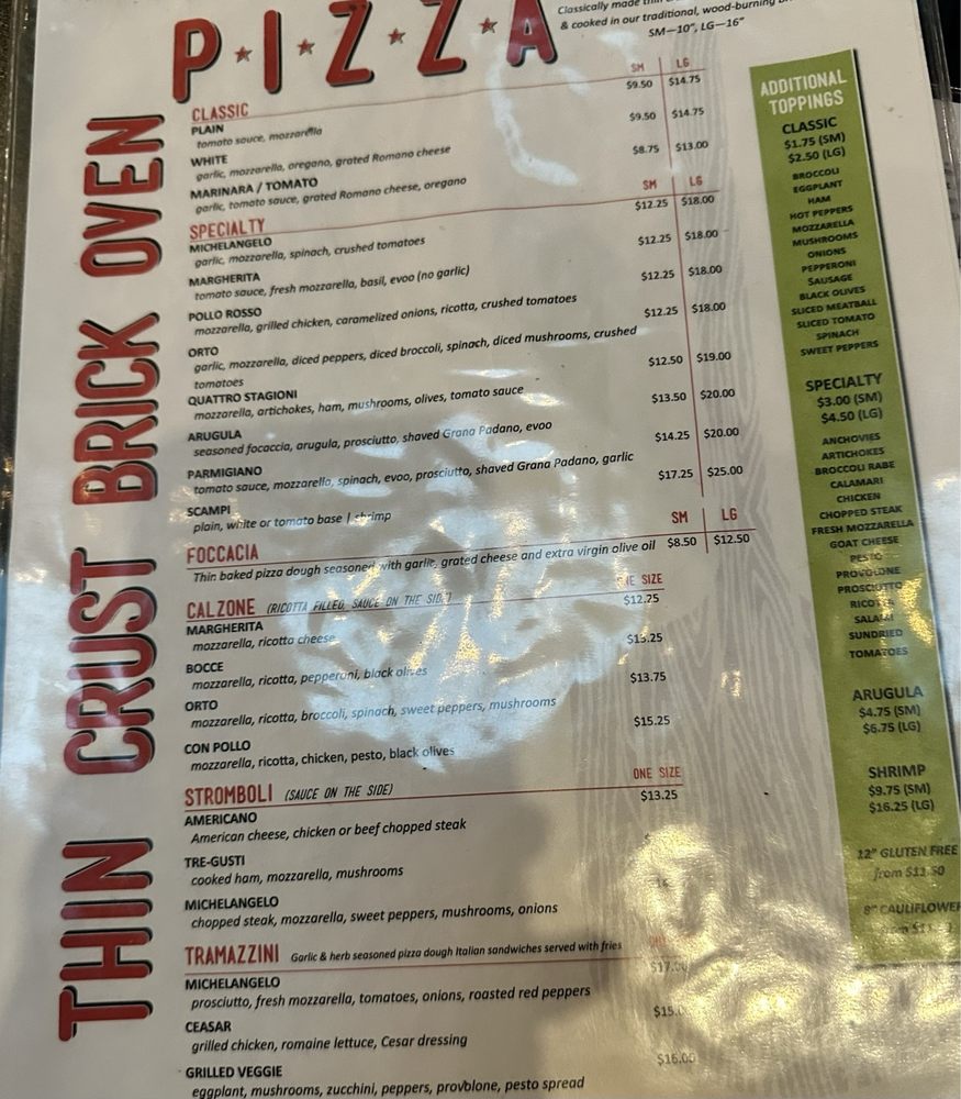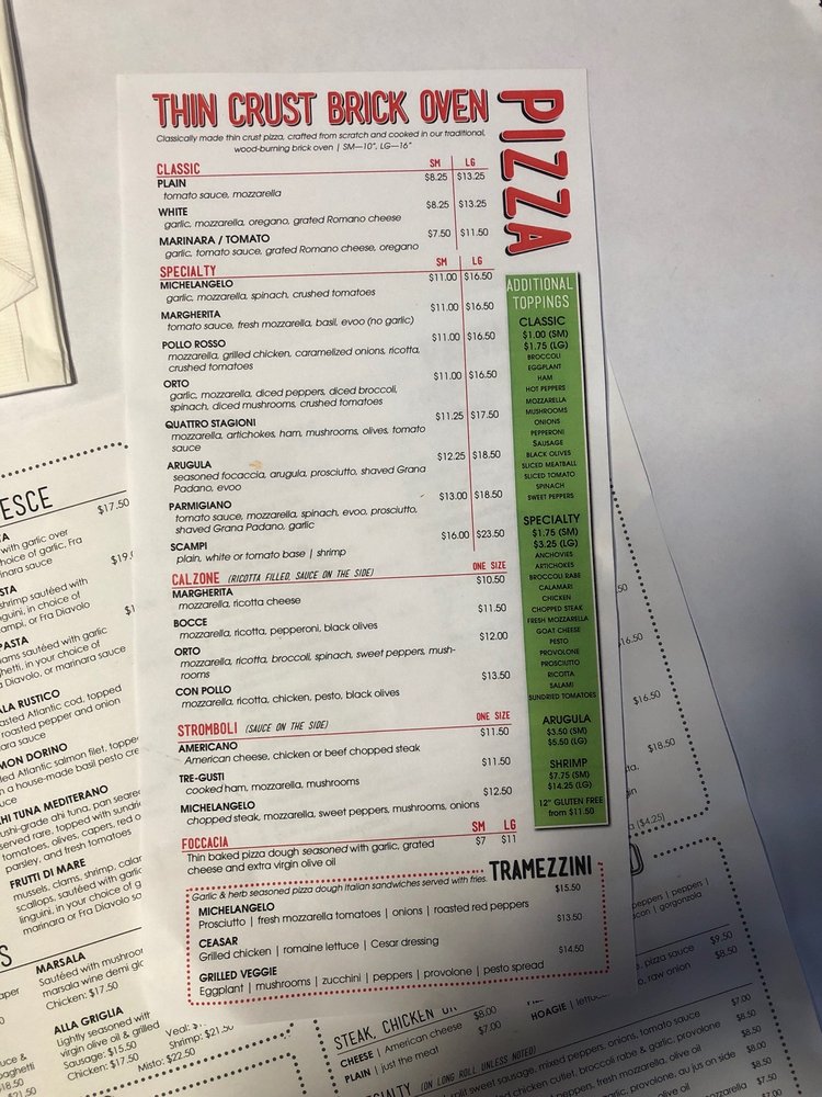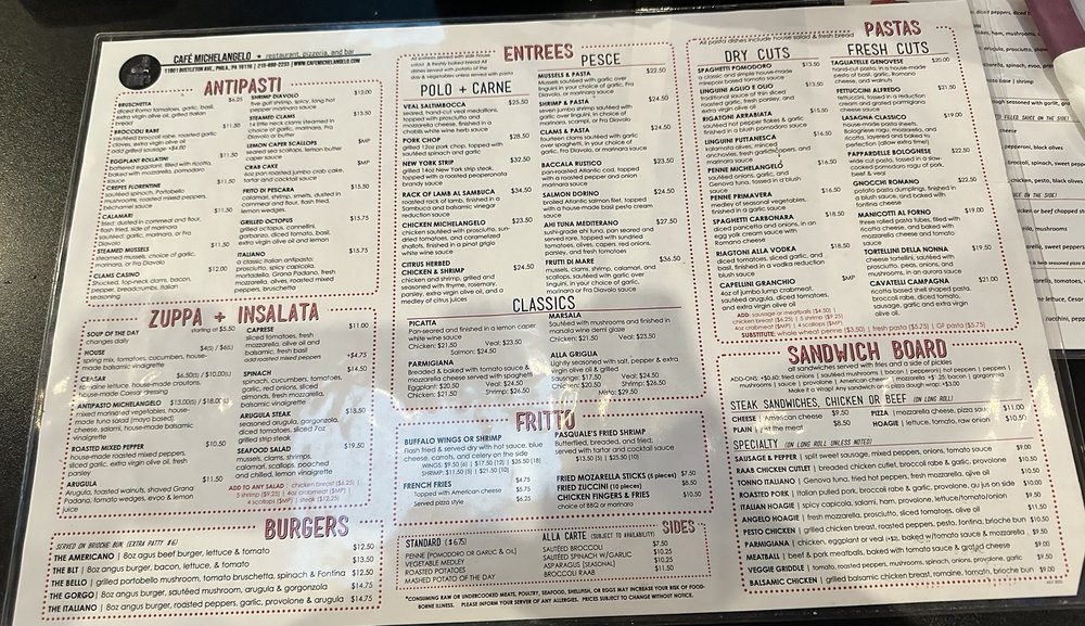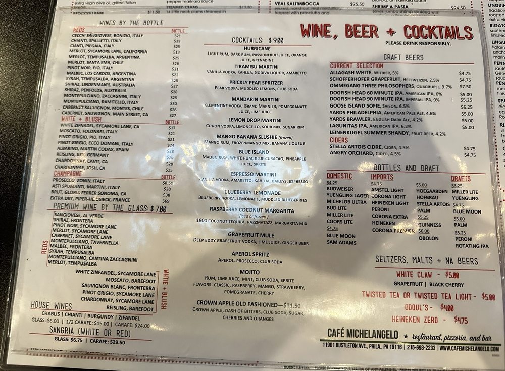 Introducing the menu at Cafe Michelangelo, located in Philadelphia, PA. This Italian restaurant offers a variety of classic and specialty pizzas, including the popular Michelangelo Pizza with garlic, mozzarella, spinach, and crushed tomatoes. The cozy setting is perfect for a casual dinner or late-night bite, with options for vegetarians and kids. Don't miss out on their delicious house salads or the flavorful Pollo Rosso Pizza with grilled chicken, caramelized onions, ricotta, and crushed tomatoes. With options for delivery, takeout, and catering, Cafe Michelangelo is a go-to spot for a satisfying Italian meal. Explore their menu and experience the flavors of Italy right in your neighborhood.